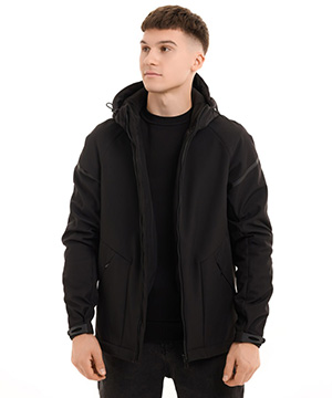 Черная демисезонная куртка из софтшела с капюшоном К-1529