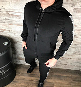 Спортивный мужской костюм черного цвета.Классическая модель с капюшоном,карманами и белыми лампасами.Изготовлен из качественной ткани.Костюм очень практичен,в нем вам будет комфортно.