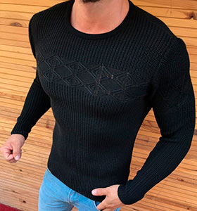 Мужской свитер черного цвета.Изготовлен из качественной акриловой нити с добавлением коттона.Ворот открыт.Вязка "лапша" с интересным рисунком в области груди.Модель будет сочетаться как с джинсами,так и с классическими брюками.В этом свитере вы будете выглядеть очень стильно.