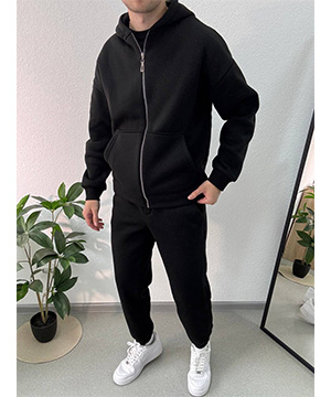 Черный спортивный костюм с молнией на кофте и капюшоном на флисе К-973