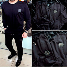 Легкий мужской спортивный костюм Philipp Plein черного цвета. Очень комфортная модель с минимальным количеством деталей и фурнитуры, выполненная с качественного хлопка приятной текстуры, благодаря чему изделие отлично носится и не натирает.