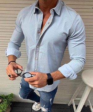 Модная голубая джинсовая рубашка с принтом на спине Р-1067