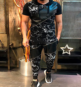 Спортивный мужской костюм черного цвета.Модная неординарная модель с коротким рукавом и интересной расцветкой.Изготовлен из качественной ткани.Костюм очень практичен,в нем вам будет комфортно.