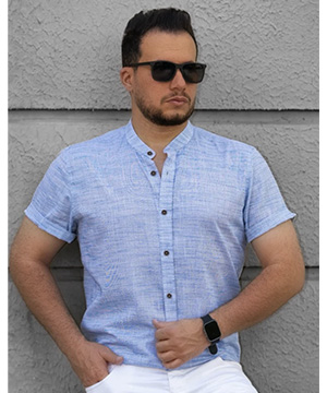 Мужская голубая рубашка с коротким рукавом воротник стойка Р-1523