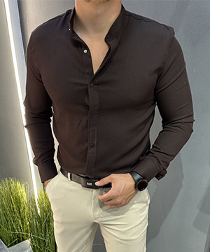 Мужская приталенная рубашка в темно коричневом цвете на кнопках Р-1535