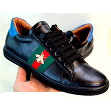 Кожаная мужская обувь Gucci черного цвета с оригинальной яркой нашивкой на боковой части. Данная модель имеет очень практичную комфортную форму, она выполнена с очень качественных, долговечных материалов, что делает ее идеальной деталью любого мужского гардероба.