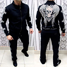 Мужской спортивный костюм Philipp Plein с очень плотного хлопка черного цвета. Эта модель очень интересно выглядит благодаря большому принту на задней части и узорам на рукавах и брюках, замечательный образец современного молодежного стиля со всеми традиционными характеристиками такого типа одежды.