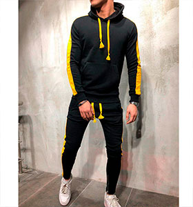 Молодежный темно-серый спортивный костюм с желтыми вставками и шнурком.Брюки свободные с заниженным шагом,заниженные книзу.Спортивная куртка на пуговицах с манжетами,с капюшоном.Материал отличного качества.Стильно,модно и комфортно.