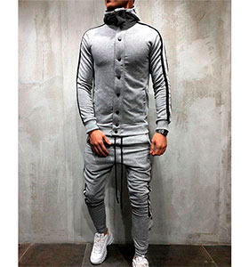 Молодежный серый спортивный костюм с черными вставками.Брюки свободные с заниженным шагом зауженные книзу.Спортивная куртка на пуговицах с манжетами,с капюшоном.Материл отличного качества.Стильно,модно и комфортно.