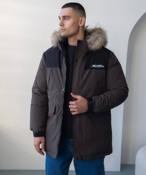 Стильная мужская коричневая куртка на зиму с мехом на капюшоне К-1545