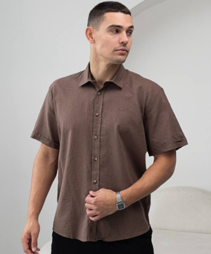 Стильная светло коричневая льняная рубашка с коротким рукавом Р-1506