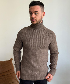 Стильный темно бежевый вязаный мужской свитер с высокой горловиной Т-1323