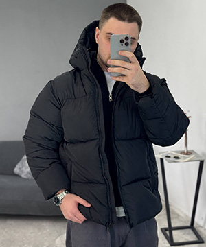 Теплый короткий мужской черный оверсайз пуховик с капюшоном К-1513