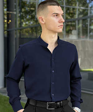 Темно синя чоловіча сорочка стійка з довгим рукавом із костюмної тканини Р-1536