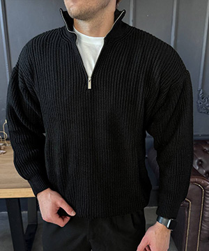 Вязаный черный мужской свитер на молнии под шею Т-1320 Вязаный свитер на молнии под шею