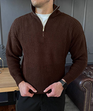 Вязаный мужской темно коричневый свитер на молнии Т-1318 Вязаный свитер на молнии под шею