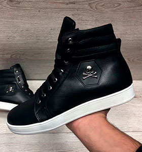 Кожаные мужские зимние ботинки PHILIPP PLEIN на меху.Спортивная модель на подошве из белого морозоустойчивого термопласта.Верх из кожи хорошего качества черного цвета на шнурках,с молодежной символикой.Практичная и комфортная обувь.